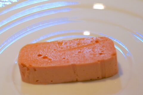食べ歩き ,白い皿の真ん中に長方形をしたムースが乗っている。 淡いピンクのムースは、付け合わせも従えず、楚々と佇んでいた。 一匙すくい、口に滑らせる。 空気を含んだテリ……