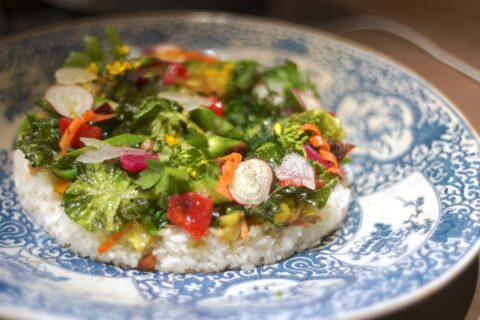 シメご飯 , 食べ歩き ,★やさいめし おばあちゃんが作ってくれ田、思い出の料理とその頃よく飲んでいた、ほうじ茶 本来は餅米とうるち米を合わせたご飯の上に根菜炒めたもの。 椎茸戻し汁と……