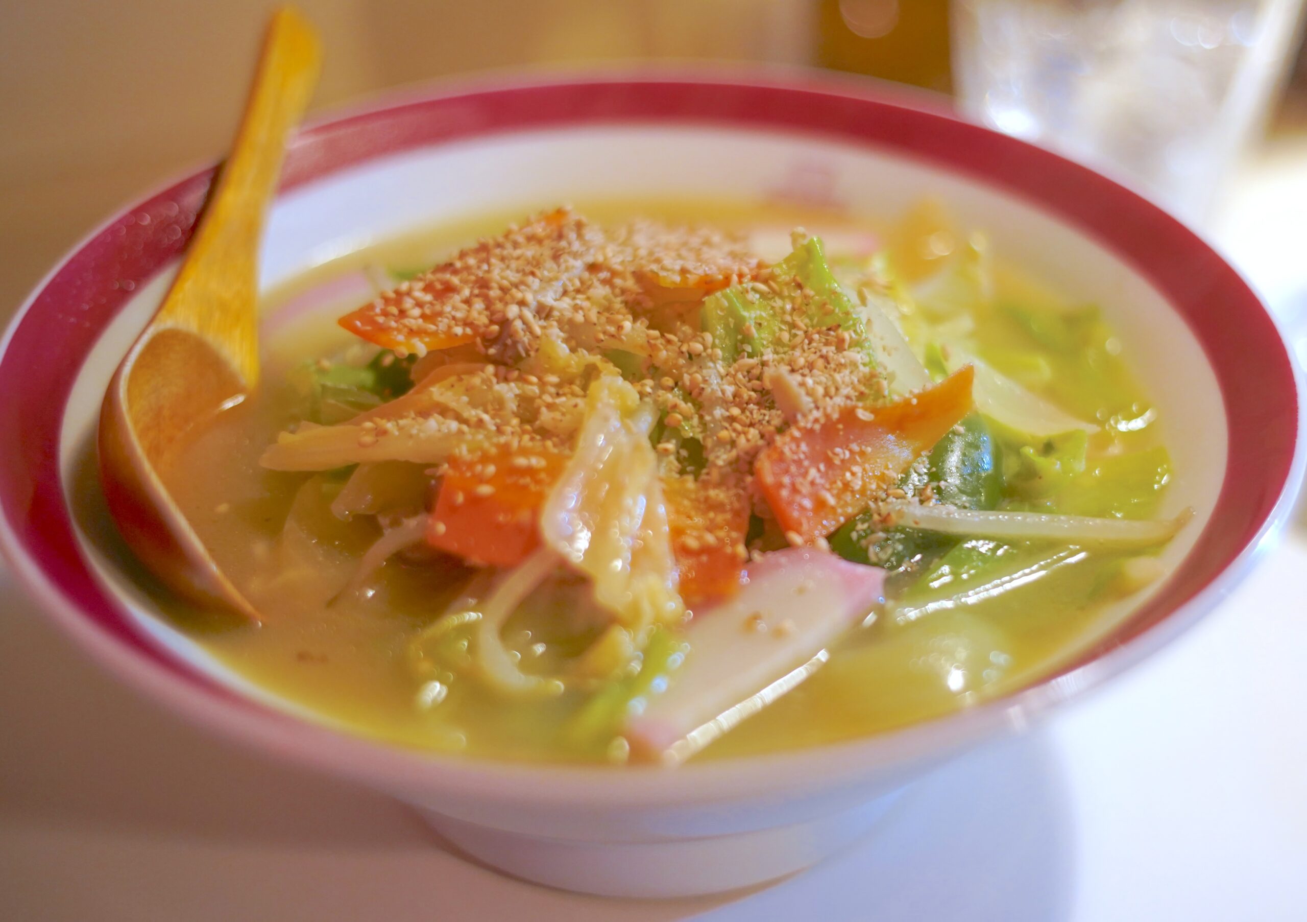 通常の塩ラーメンに野菜や豚のうまみが溶け込んだ、まろやかな味が舌を通り過ぎる。
