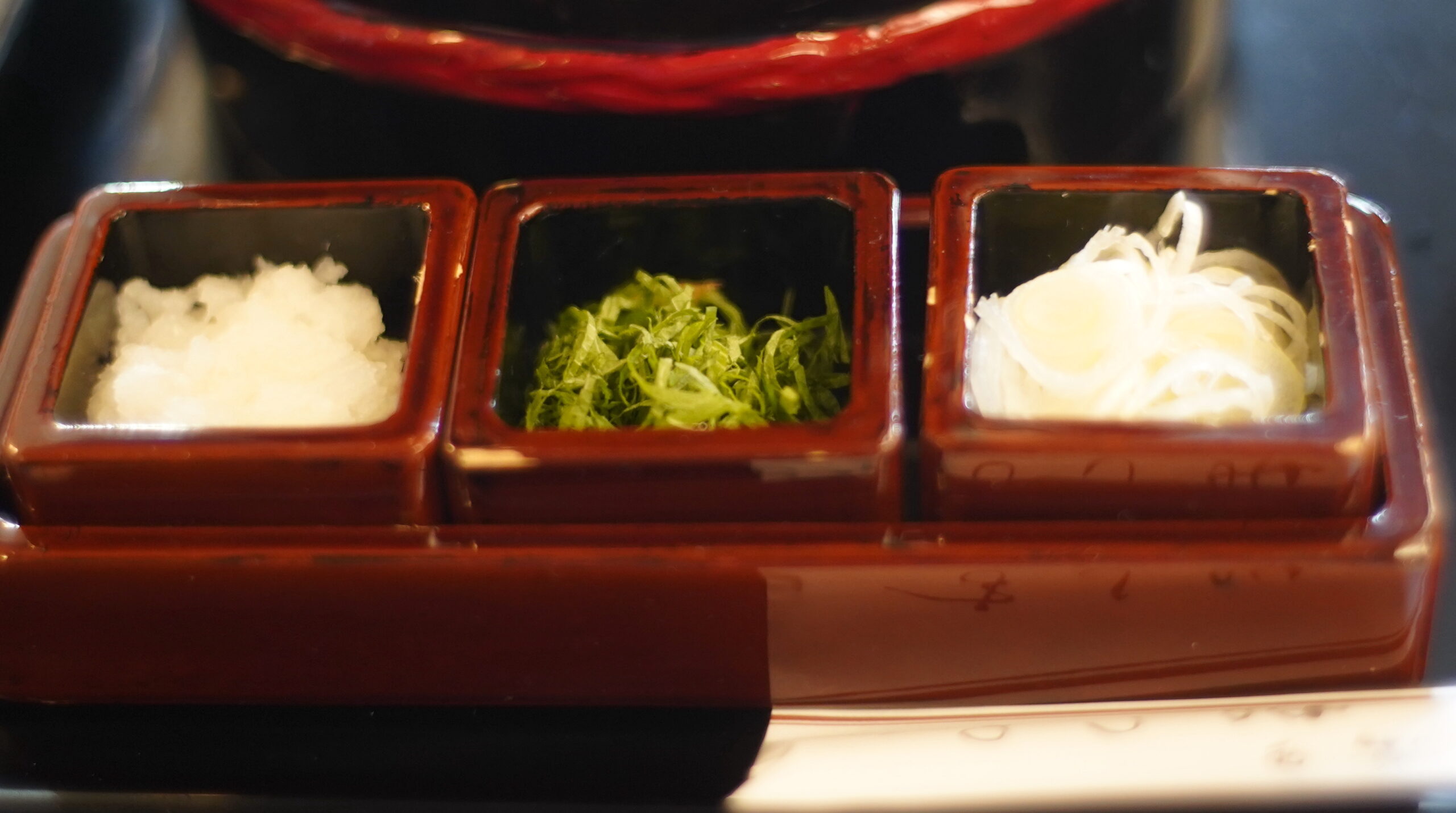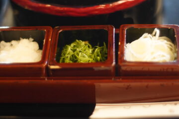 大根おろし、紫蘇の極細切り、洗いネギを適時猪口に入れ、、うどんとの出会いを楽しむ。