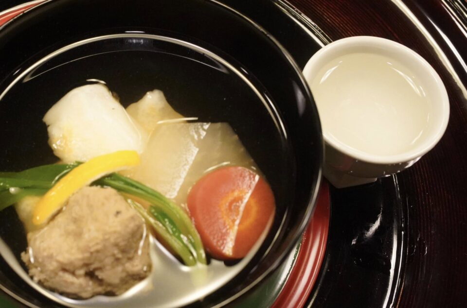 椀種は、うずらの丸に亀甲大根、日の出人参にほうれん草、そして長方形角に切った焼餅である。