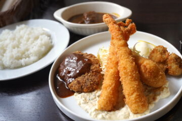 今回は欲張って、「スペシャルミックフライ定食」に、カキフライ一個とミニビーフカレーソースをつけた。