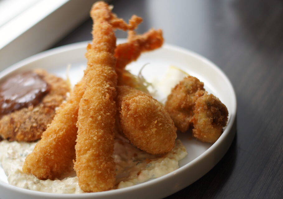 メンチカツは、脂感より肉感があり、カキフライは、ウースターをかけても負けぬ甘みがある。