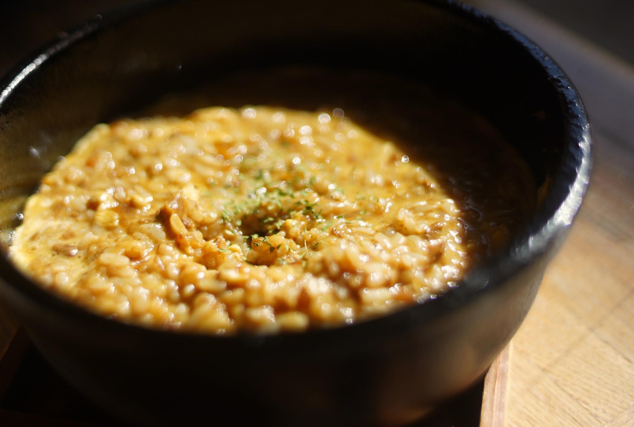 カレー混ぜご飯が石焼となり、薄焼き卵は鍋の縁に沿ってある不思議