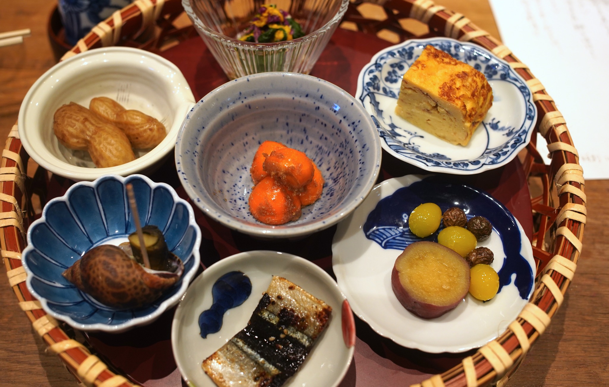 虎横「小川はな食堂」 先付盛り合わせ、これだけで酒2号以上飲めるではないか。中でも進化した卵焼きがいい