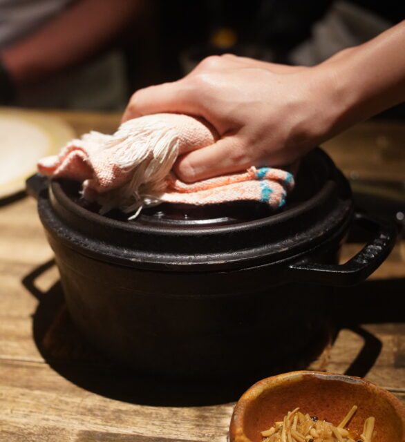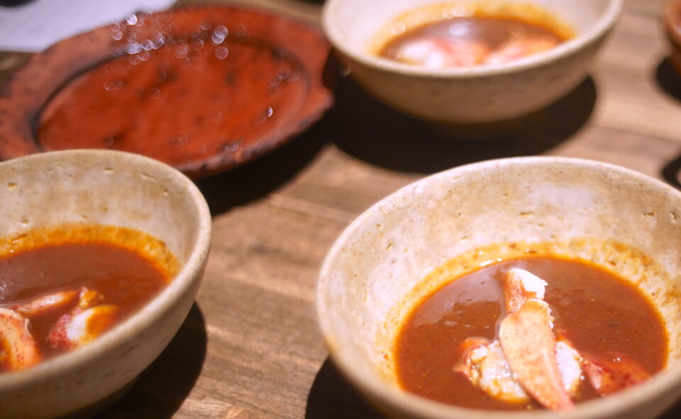 トウモロコシと貝柱、そして海老。 2025.06.05 シメご飯 , 食べ歩き , 東京 , 海老 , ご飯料理 , フランス料理 , インド料理 , カレー , Tweet 炊きたてトウモロコシのビリヤニ。干し貝柱の出汁で炊いたという。その旨味がとうもろこしの甘みと響き合って。しみじみとうまい。そこへニゲラがひりっと辛味をアクセント。そこにさらに反則技。車海老の頭とブラックタイガーで出汁をを取り、オマールの身を載せた海老カレー。甘みと旨味で、天国へ押上スパイスカフェで行われた「星のや東京」岡シェフと伊藤シェフのコラボ会にて