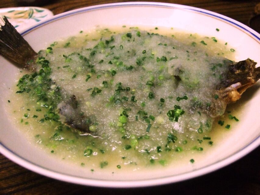 かれいの品の良い甘みと出汁のうまみ、大根の甘みが渾然一体となって、燗酒の甘みにぴたりと寄り添う。
