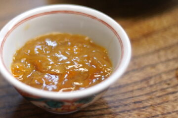 特に胡麻酢和えは、京都の「浜作本店」でも出される昔ながらの料理で、クラゲ、胡瓜、椎茸をあえ、それぞれの仕事と利用のバランスが見事に整った料理である。