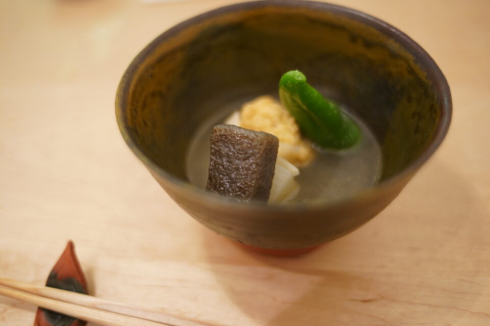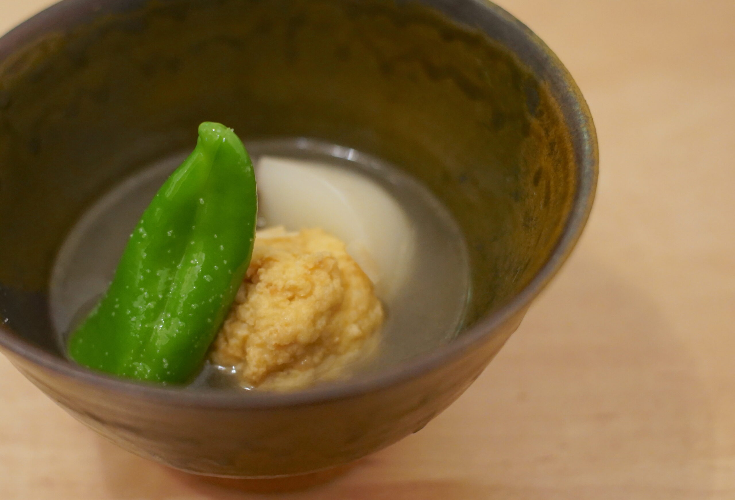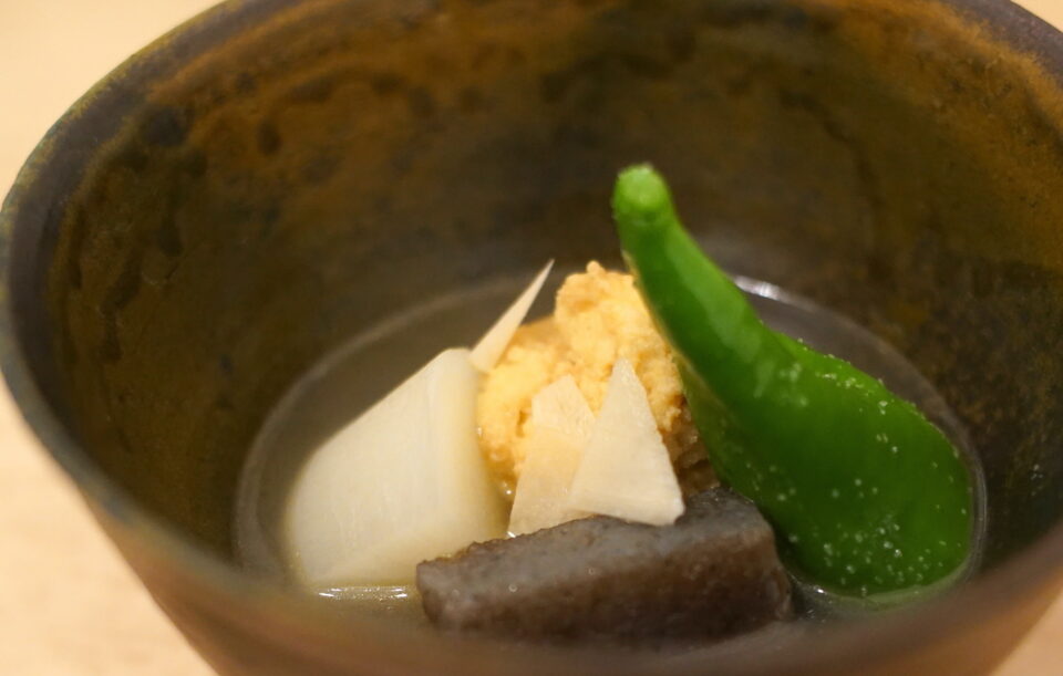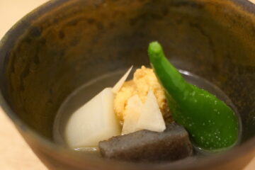 例えていえば、蕪、自家製こんにゃく、ししとう、ボタンエビのがんもどきの炊き合わせである。