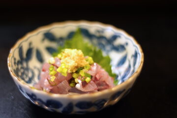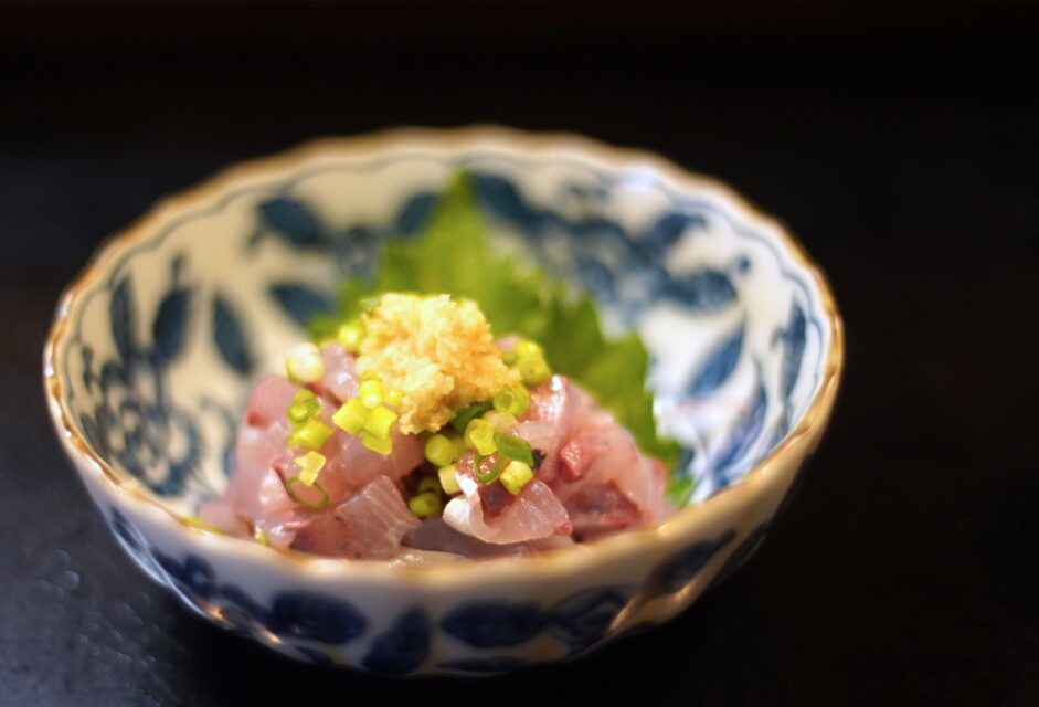 西麻布「神の戸」ヒレのユッケ、海苔とオシェトラキャビア