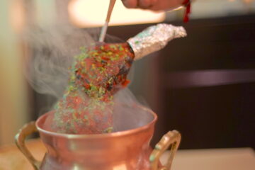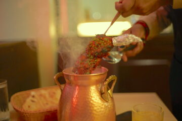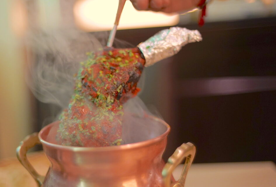 テーブルに金色の壺が運ばれると、給仕人が串を刺し入れる。