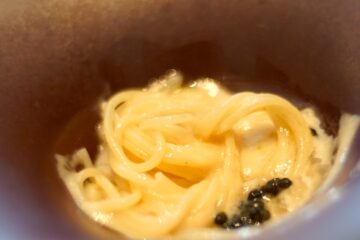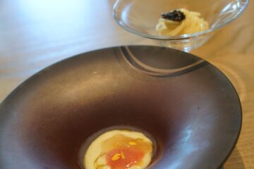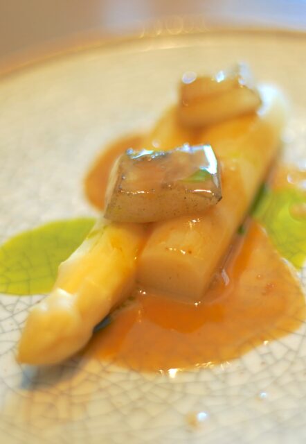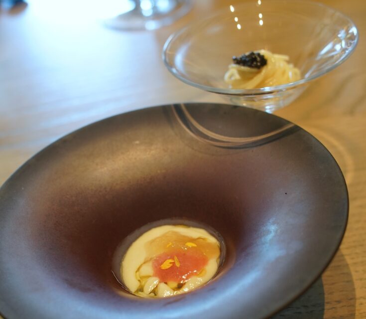 手前が新玉ねぎのピュレとトマト水、後ろがキャビアを乗せた冷たいスパゲッティである。