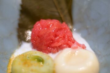 桜餅はトンカ豆とカルダモン、苺のアイス、バジルの団子、白玉は、ホワイトチョコ豆腐の団子、ぺルノーとホワイトチョコとココナッツミルク