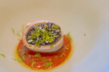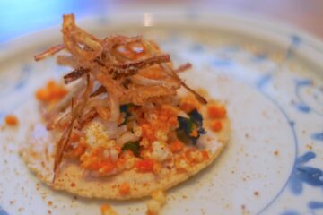黒糖のボン菓子をリゾットの米代わりにし、スナップエンドウ、ロマネスコを加えてタルタル仕立ての上に、釜揚げのシラウオ。