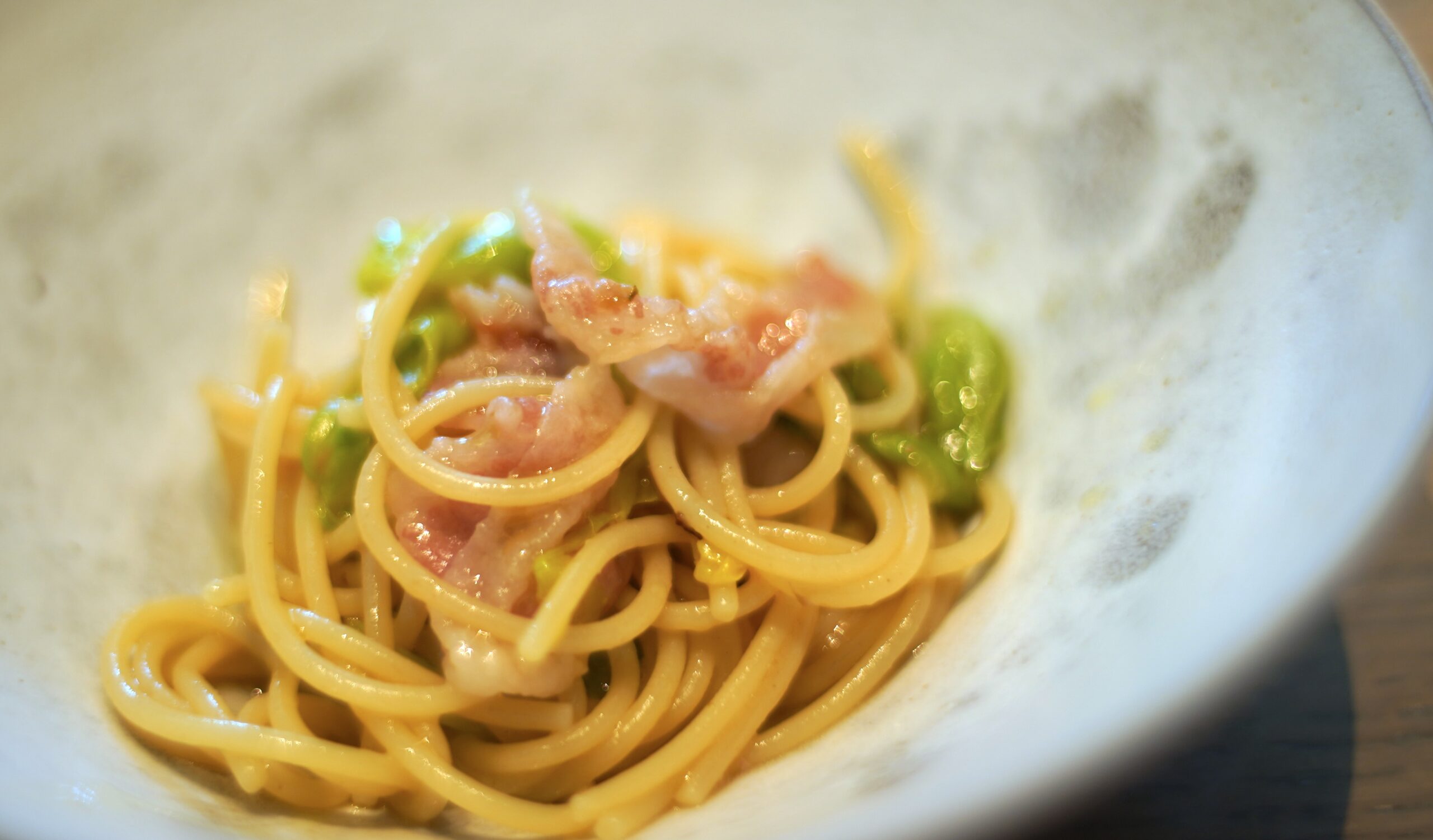 パスタで来た。春キャベツとグアンチャーレ。鳥だしと八角。