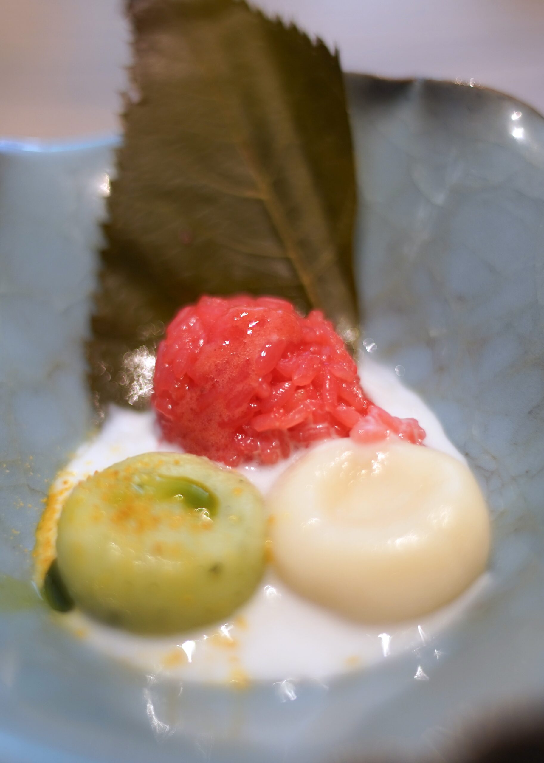 桜餅はトンカ豆とカルダモン、苺のアイス、バジルの団子、白玉は、ホワイトチョコ豆腐の団子、ぺルノーとホワイトチョコとココナッツミルク