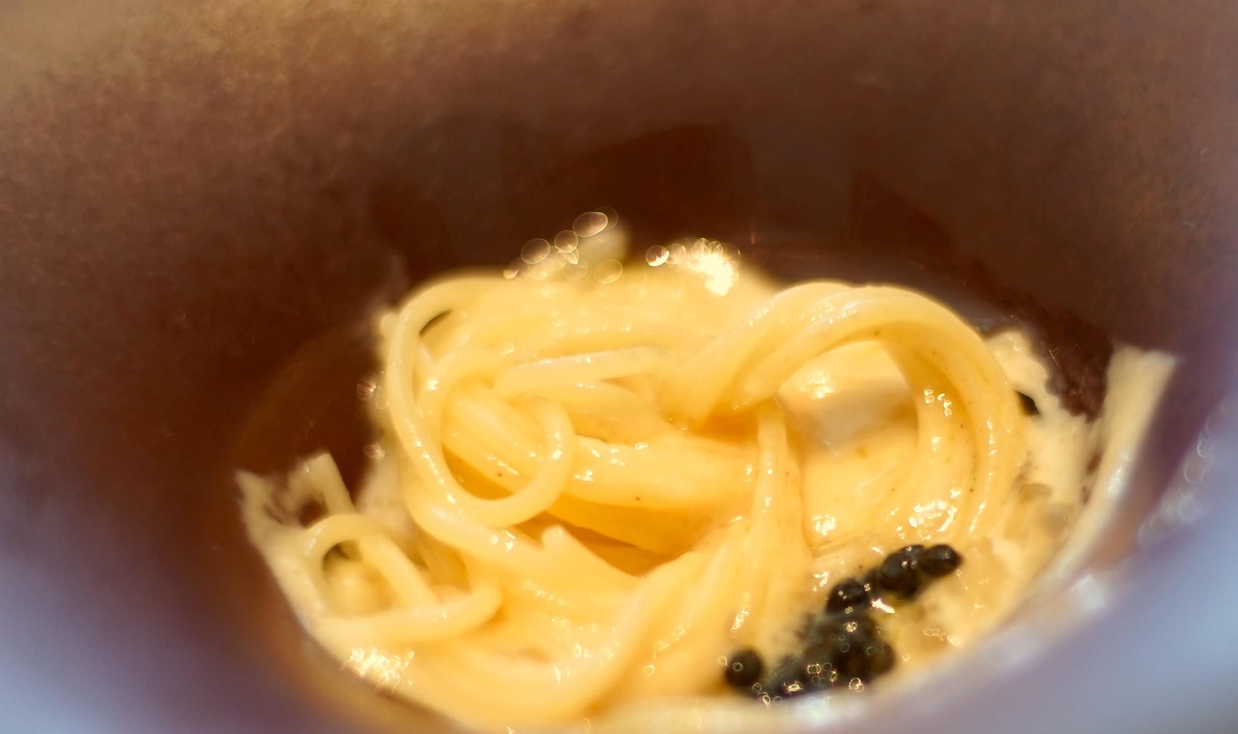 手前が新玉ねぎのピュレとトマト水、後ろがキャビアを乗せた冷たいスパゲッティである。