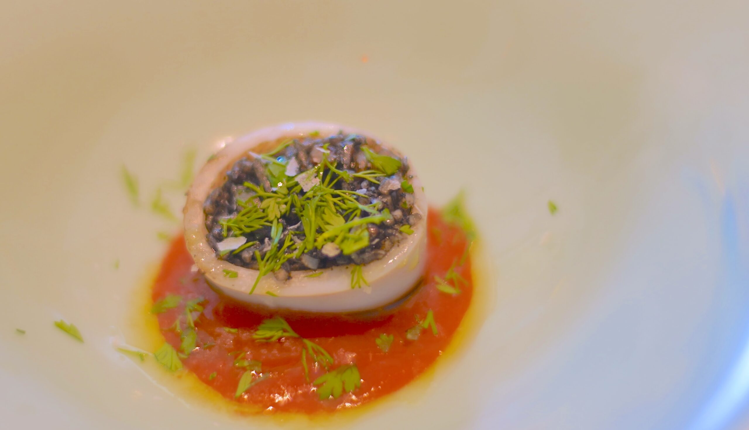 黒糖のボン菓子をリゾットの米代わりにし、スナップエンドウ、ロマネスコを加えてタルタル仕立ての上に、釜揚げのシラウオ。