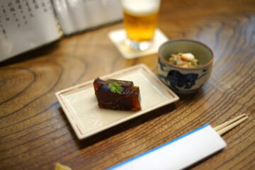 お造りは、ヒラメとオコゼの薄造りと赤貝を盛り合わせてもらった。品のある甘みを流すヒラメと、シコっとした食感からしぶとい甘みを感じさせるオコゼ、香り高い赤貝の組み合わせが良く、酒が進む。
