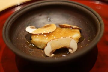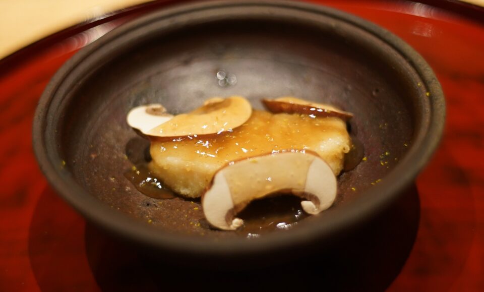 ところが出汁は使わずに、ポルチーニの生と干したものの出汁の餡をかけ、ゆずと生のブラウンマッシュルームを添えてある。