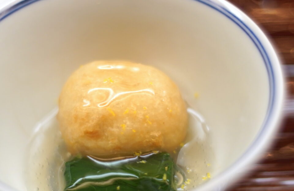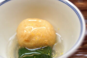 小松菜を添え、団子の中には加賀蓮根が射込んである。