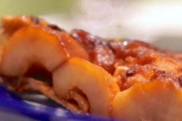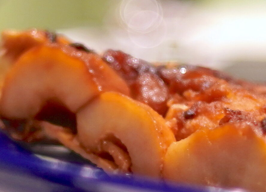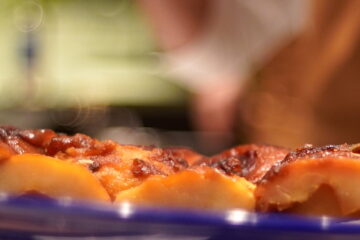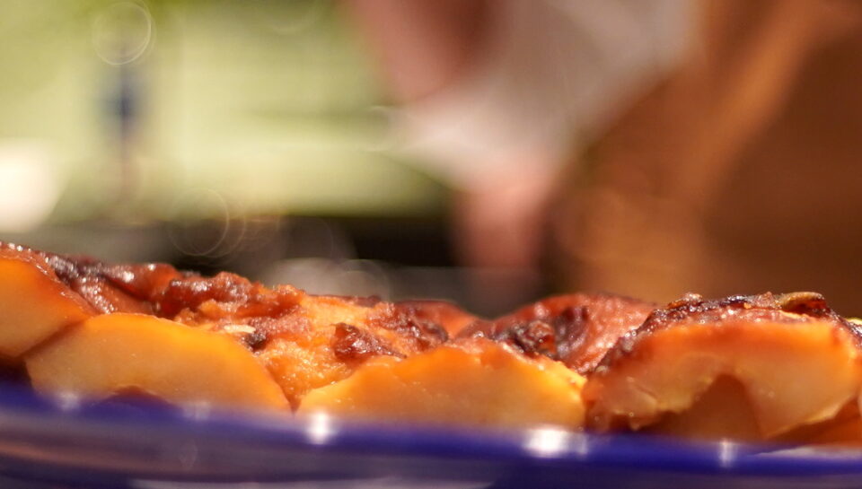 通常はスライスしたリンゴを並べて作るが、これは半割にしたリンゴがぎっしりと詰まって、焼かれている。