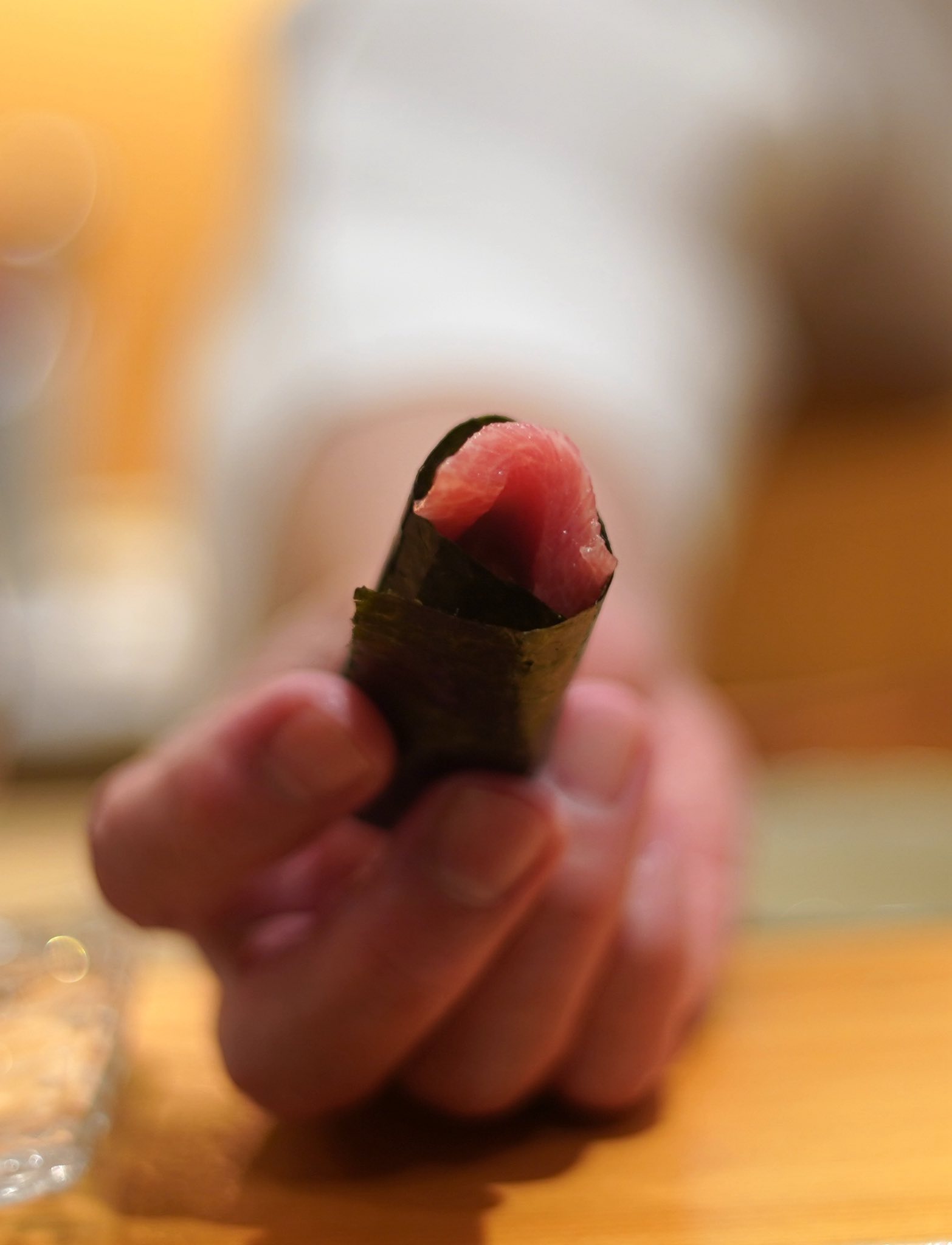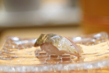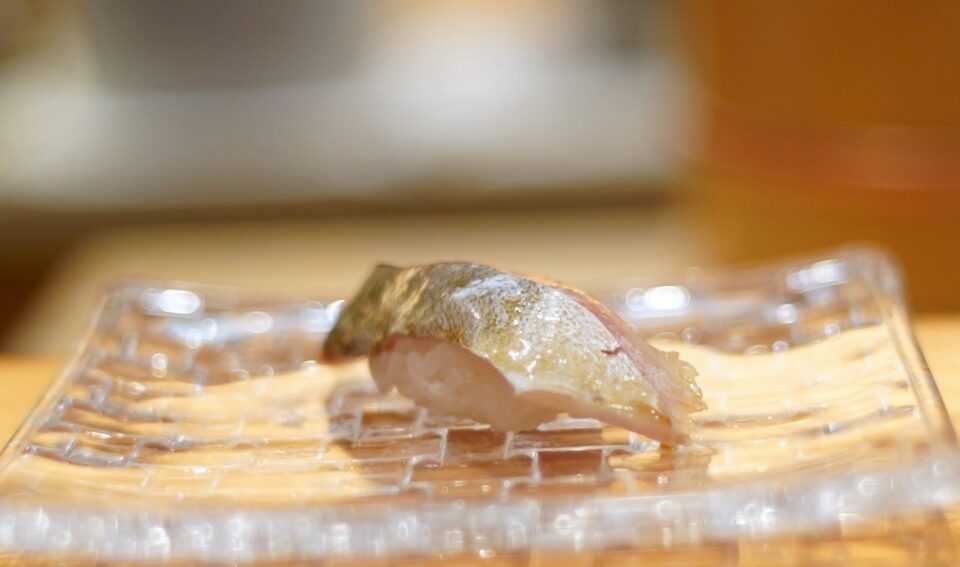 店の入り口に江戸前寿司研究所との表札があるようんい、古い江戸前仕事を守っているが、その中でワインに合うように仕事を新たに考え出されているのだった。