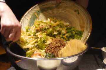 炒めて味付けた挽肉と葉っぱ類を合わせ、ご飯に投入し、混ぜる、混ぜる。