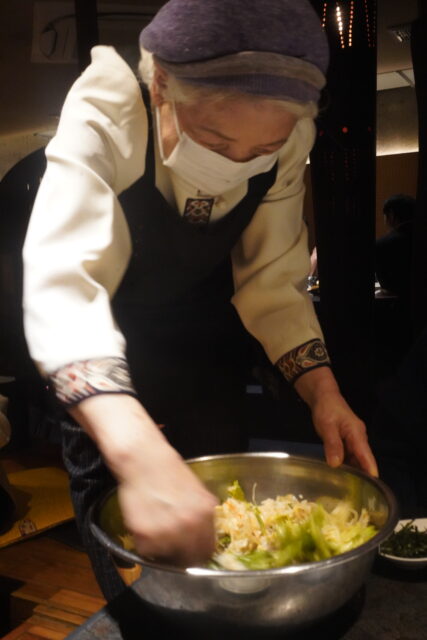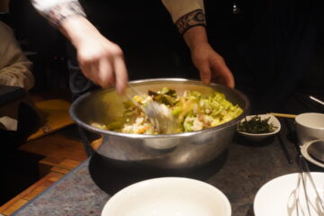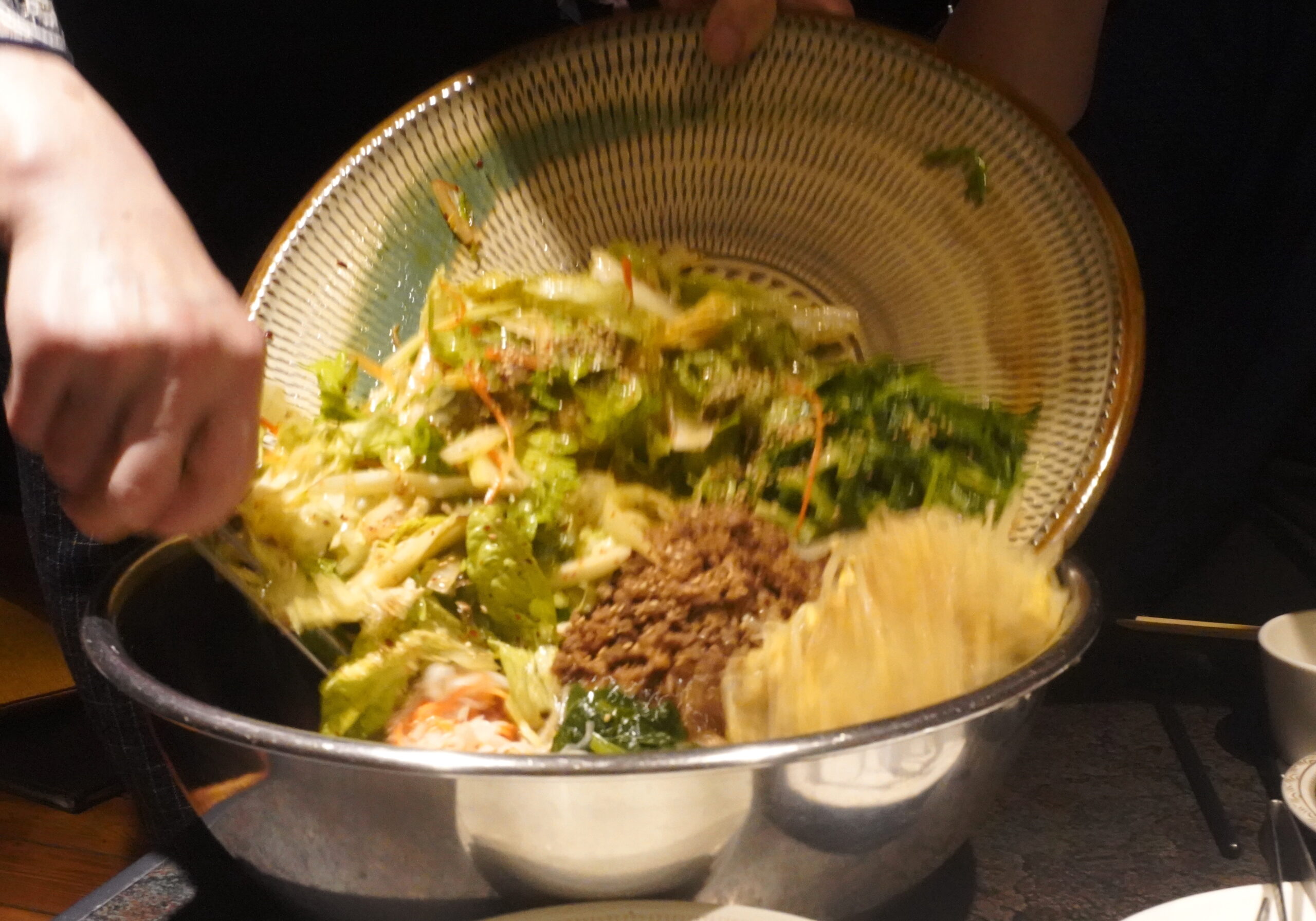 これでもかというほどに念入りに、満遍なく混ぜて均一化したら、薬念とキムチの汁を入れてさらに混ぜる。
