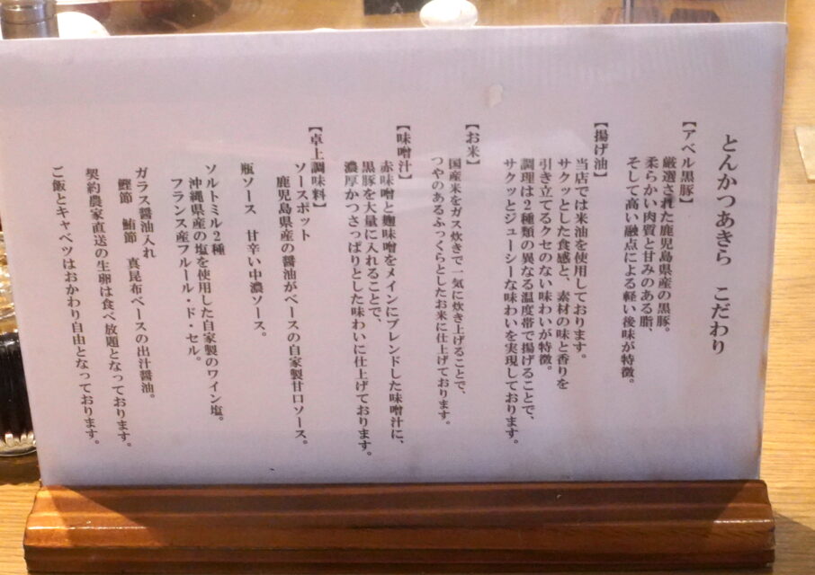 さてとんかつである。アベル黒豚とは、鹿児島の気候と飼料を生かしたバークシャー種の改良黒豚で、旨み・甘み・香り・柔らかさの面でトップクラスの品質を誇るのだという。