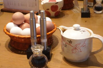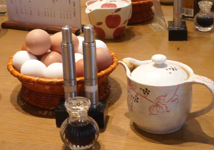 卓上に生卵が置いてあり、TKGで締めることができる。