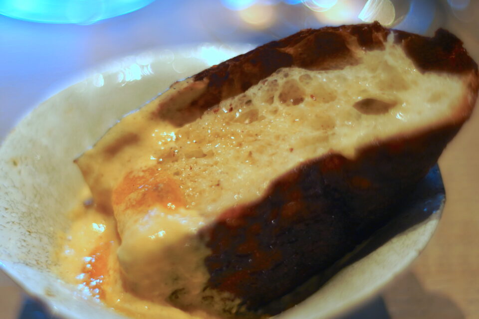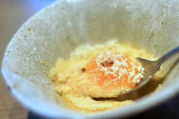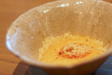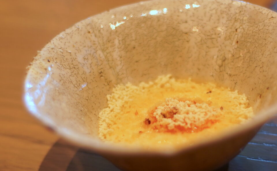 しかし、熟した柿の老練な甘みとフォアグラの甘い脂の香りが出会うと、なんとも妖艶な味が生まれる。
