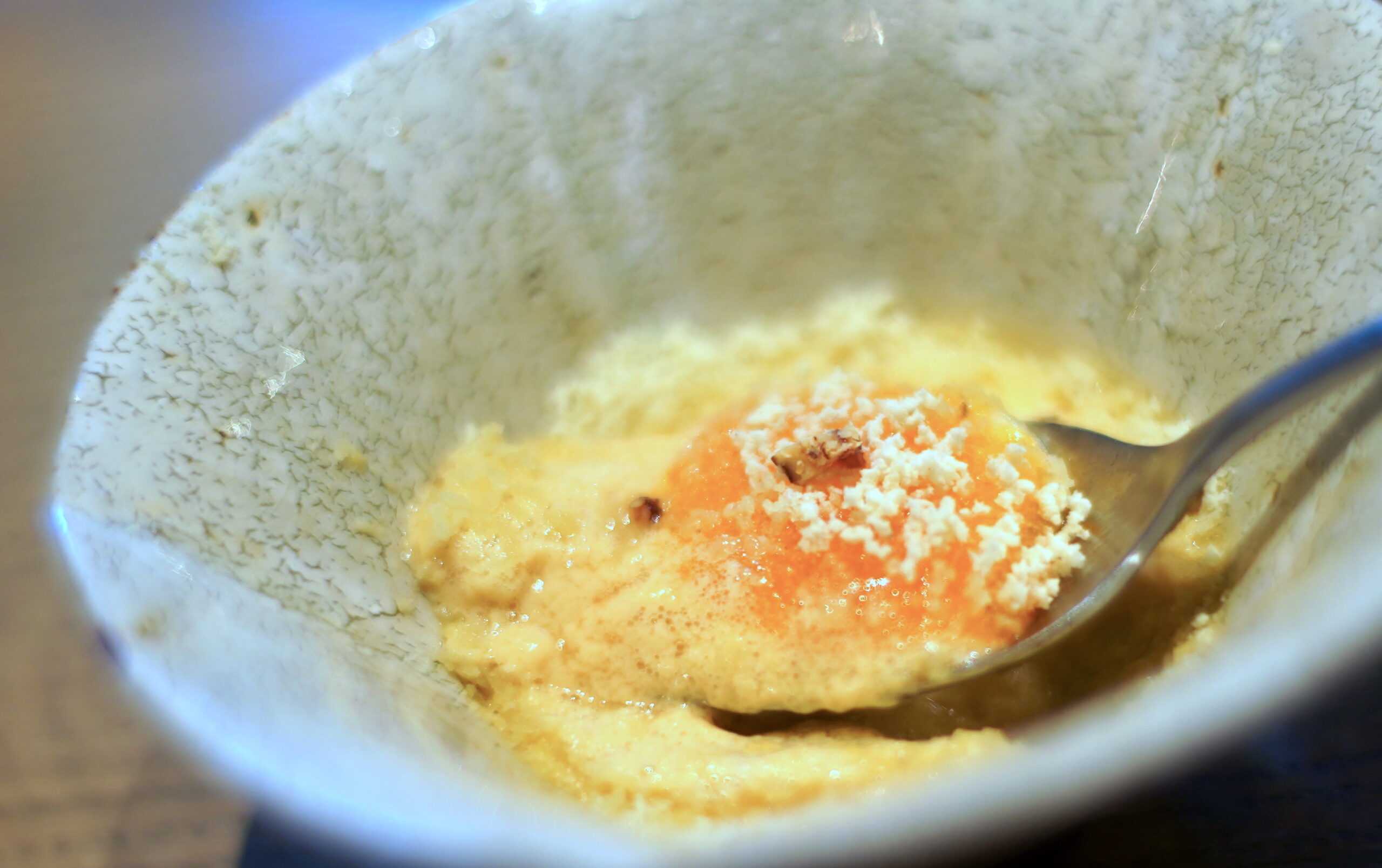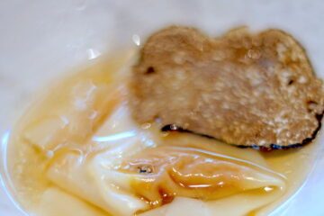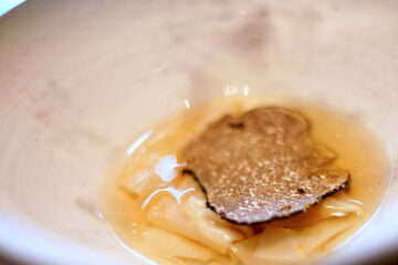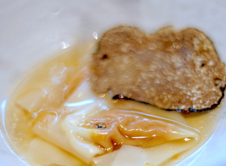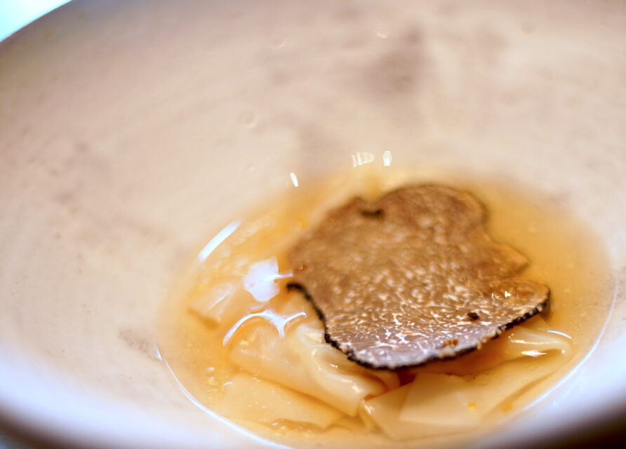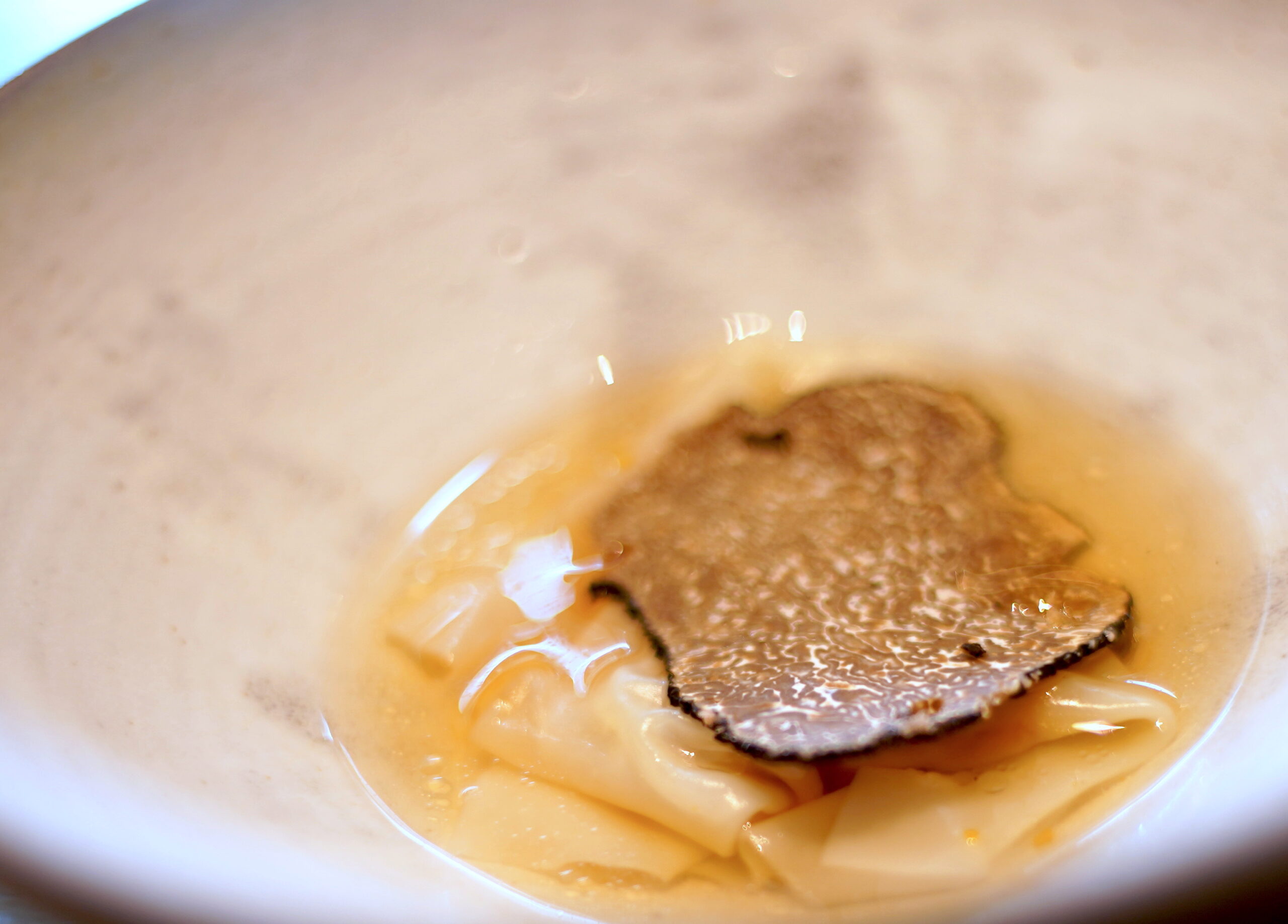 「ファルトタリオリーニ(偽物のカッペリーニ)」と名付けられた、シナモンの香りを忍ばせた、鹿とほうき鳥のコンソメに南瓜のトルテッリとトリュフをかけた一皿は、なによりコンソメが素晴らしかった。
