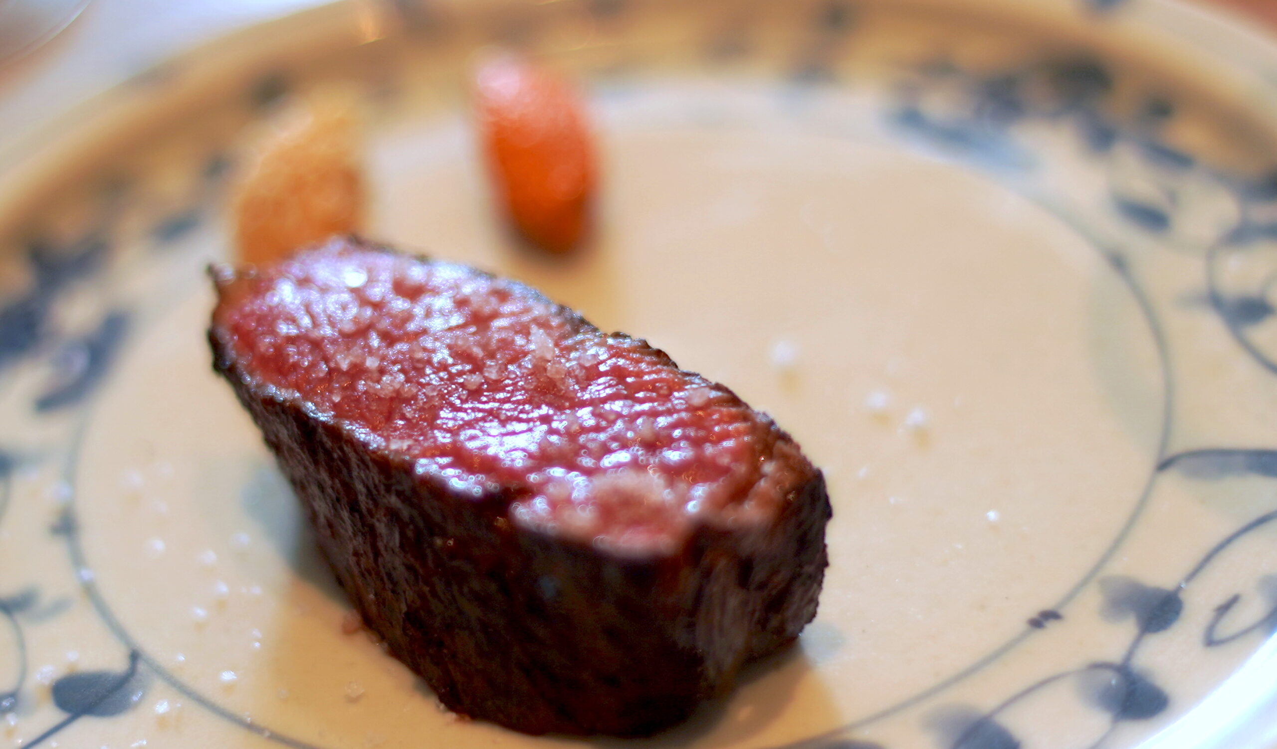 鹿肉のコンソメながら、鶏が入っている分淡く上品で、そこへワンタンのような薄皮のトルテッリとカボチャの甘さが溶けていく甘美が生まれる。