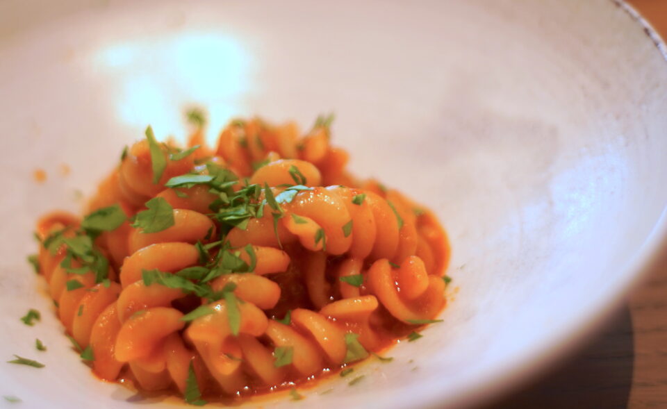 といってもそこは奥野シェフ、発酵豚肉とフジッリのアラビアータで、一筋縄ではいかないうまみが潜んでいた。