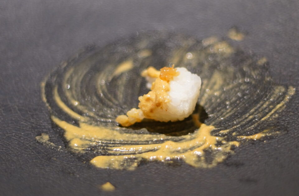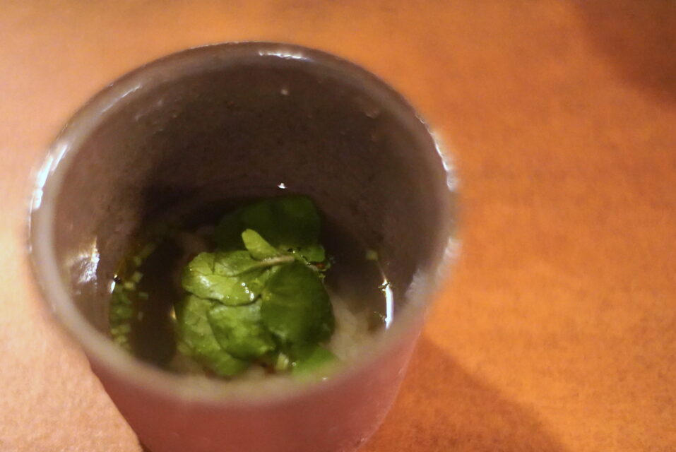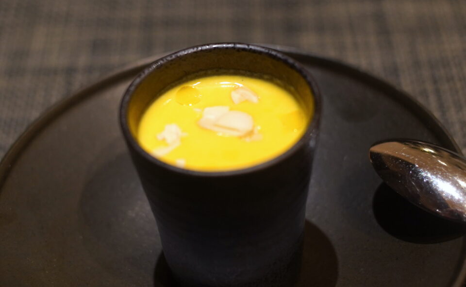 るような重湯のソースと、提供時に枯葉の焼いた香り