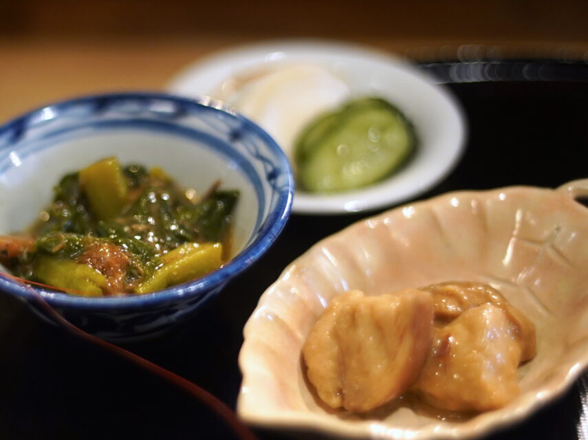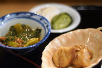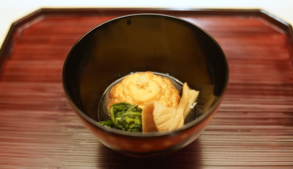 24 昼 「浜町 緒ばた」割烹 煮物 干しぜんまいを射込んだひろうす、越前春菊 別コラムを参照してください