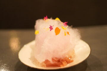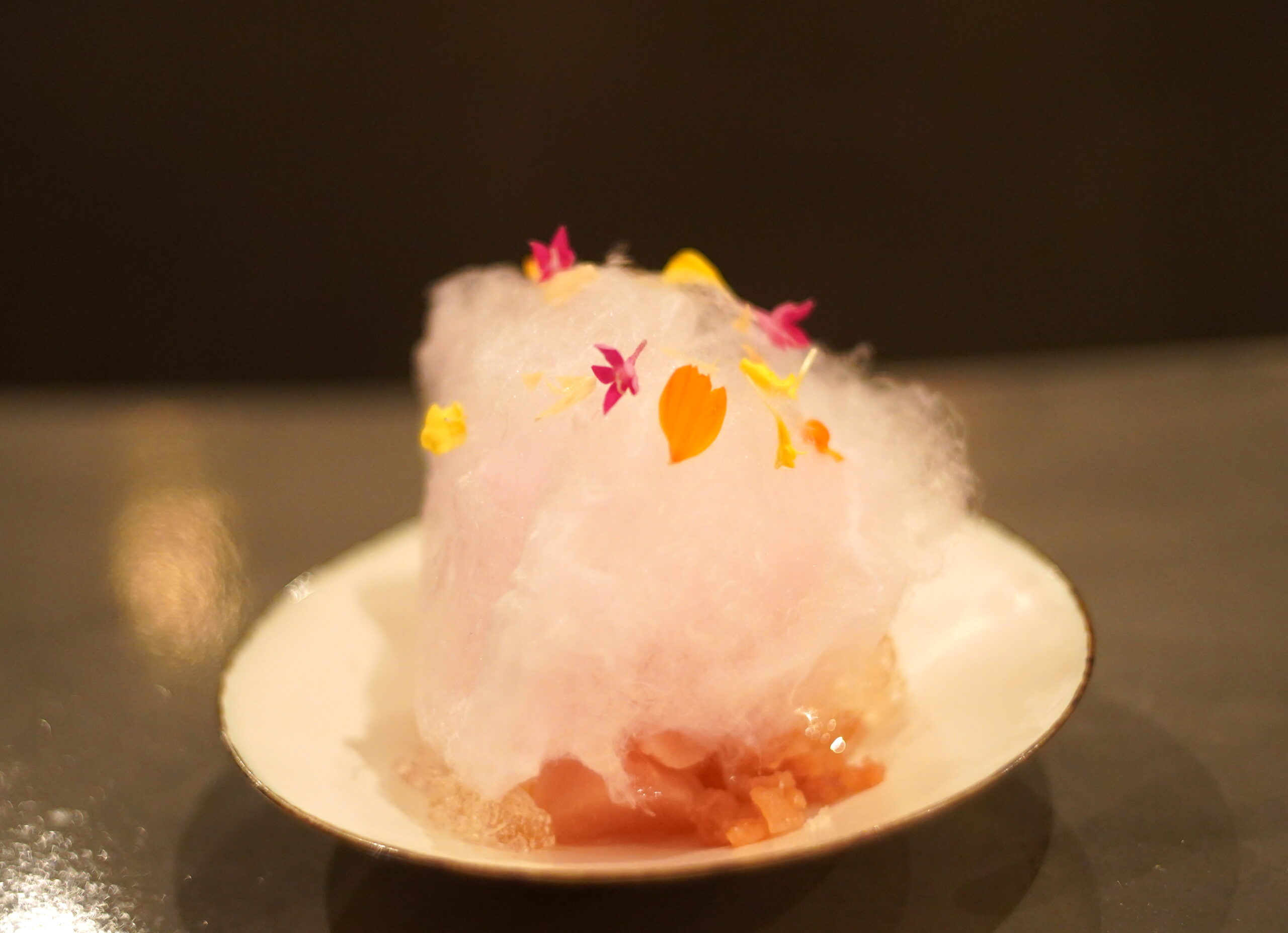 綿菓子とカンノーリ 。 2025.09.03 食べ歩き , 1日1甘 , 東京 , イタリア料理 , 果物 , スィーツ , Tweet 2自由が丘 イタリアン「siamo noi」 ★桃のコンポート 綿菓子にローズウォーターをかけて湿らせて。 氷やアイス、 パンナコッタを詰めたイチジクの皮のカンノーリ