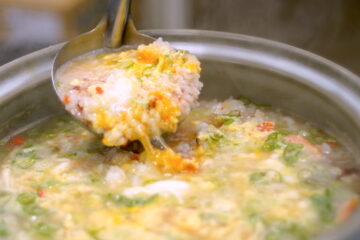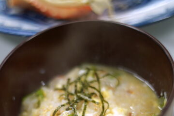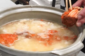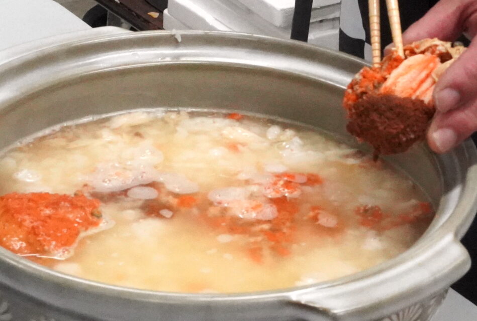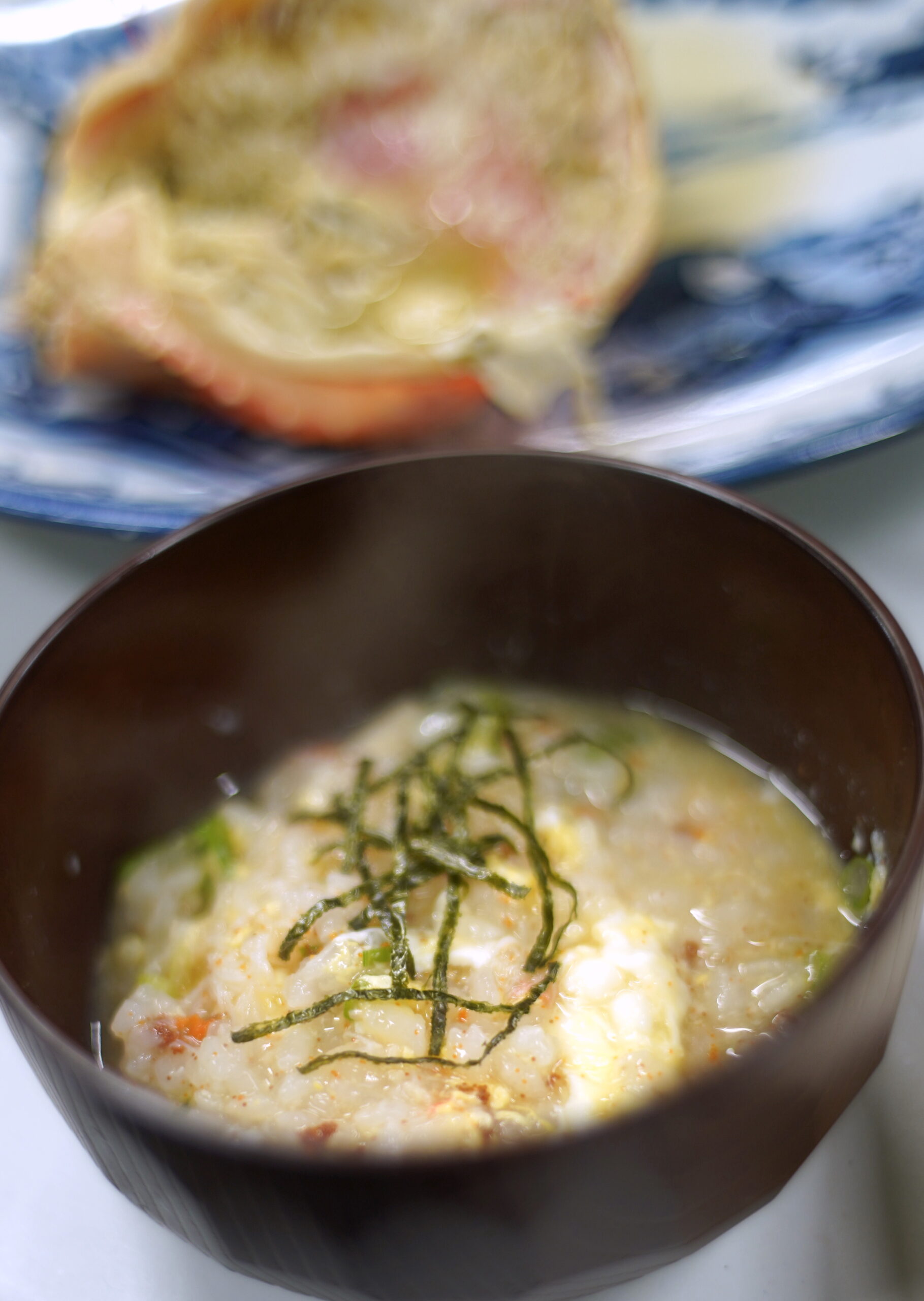 最後は雑炊で「蟹雑炊は、セイコを入れなくてはいけない」と、内子や外子をたっぷり入れた、濃密な雑炊でしめたのでありました