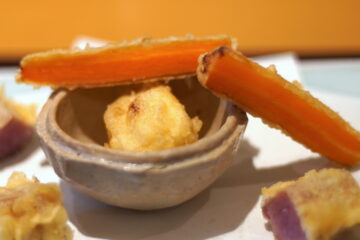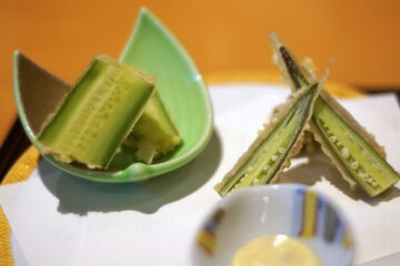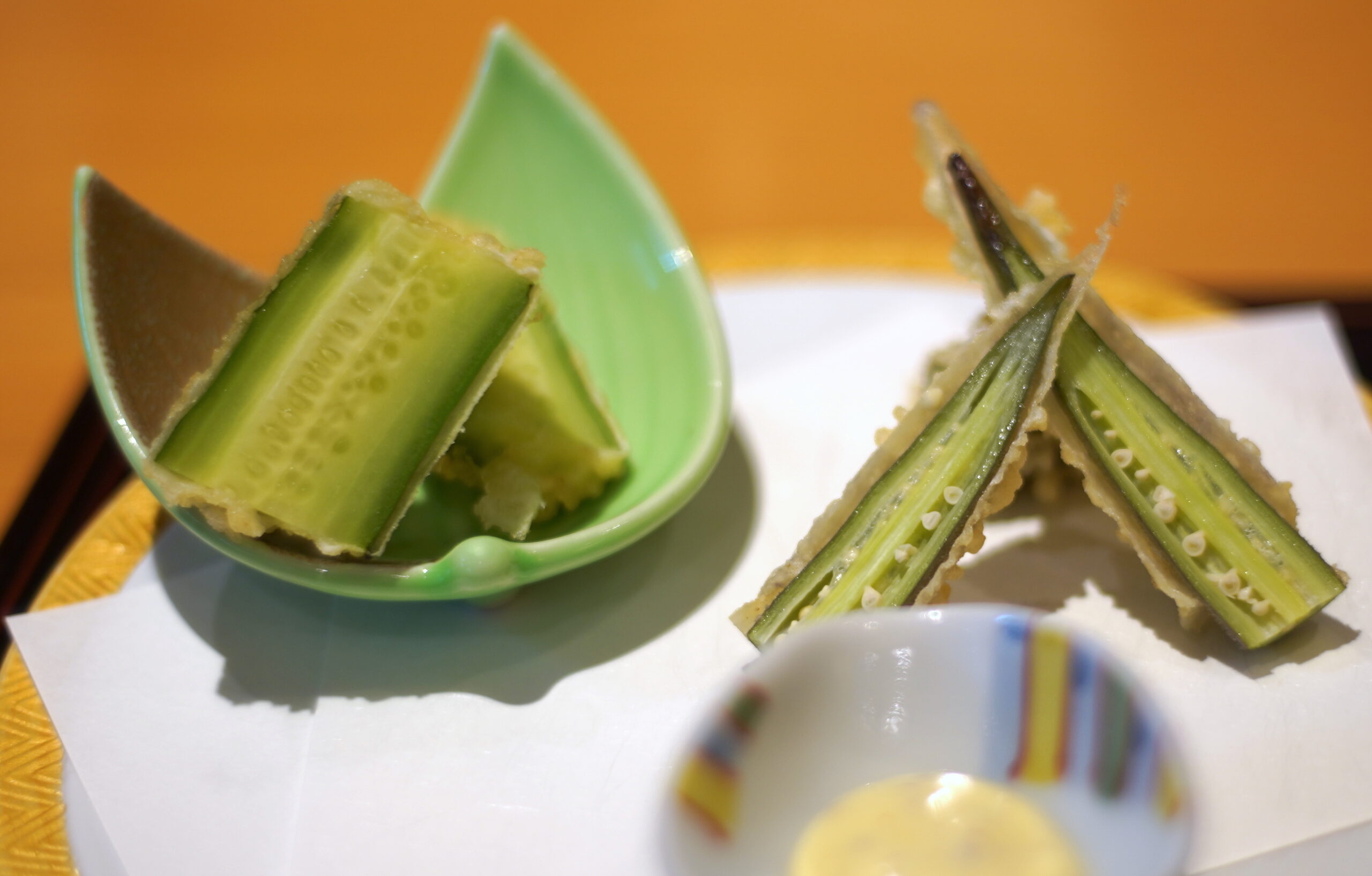 スーパーで売っている胡瓜と茄子を食べ比べ、その違いに驚いてもらった上に、天ぷらにした。