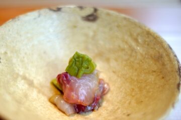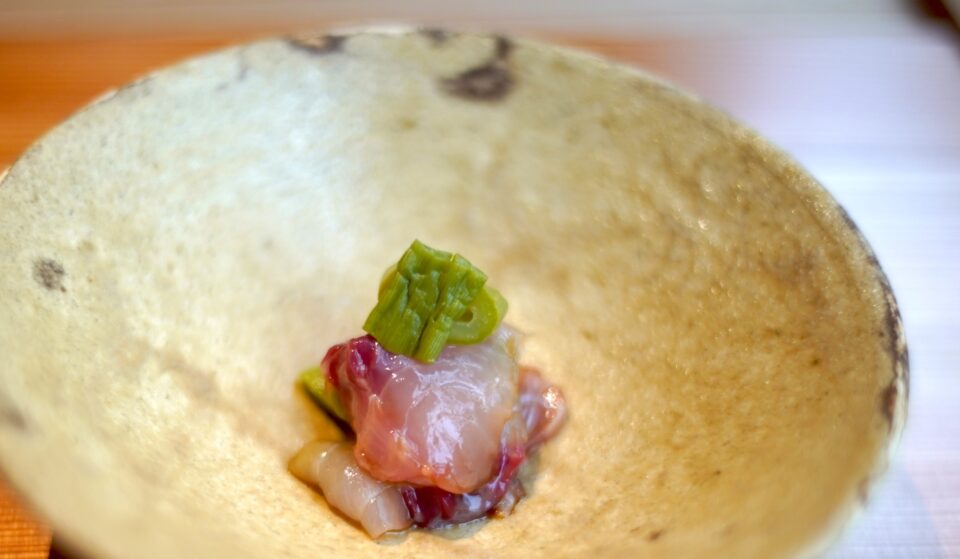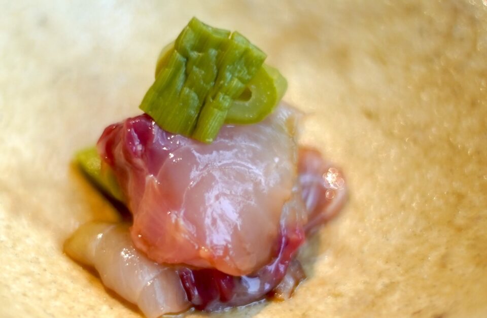 ふきのとうのオイルと醤油を合わせて、蕗のとうペーストを挟んだ鯉のお造りである。