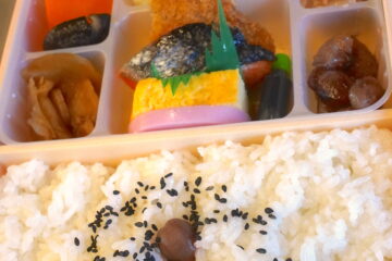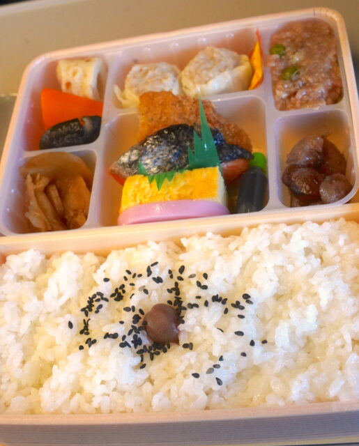 (国産米使用)、 煮物 (椎茸、竹輪、人参、金時豆)2、大根醤油漬1、蒲鉾1、小梅漬1、ごま、銀鮭塩焼き2、玉子焼き1、フライ1、シュウマイ2、筍鶏そぼろ2、添付からし/