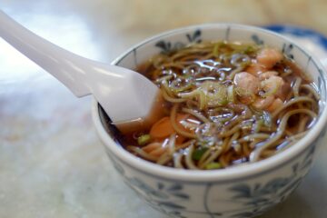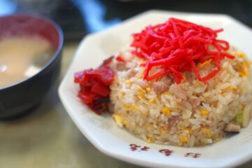 さらに「かしわそば」のそばは、なぜか茶そばであ離、炒飯は味わいが淡く、そのかわりに紅生姜が、たっぷり乗せられているのであった。