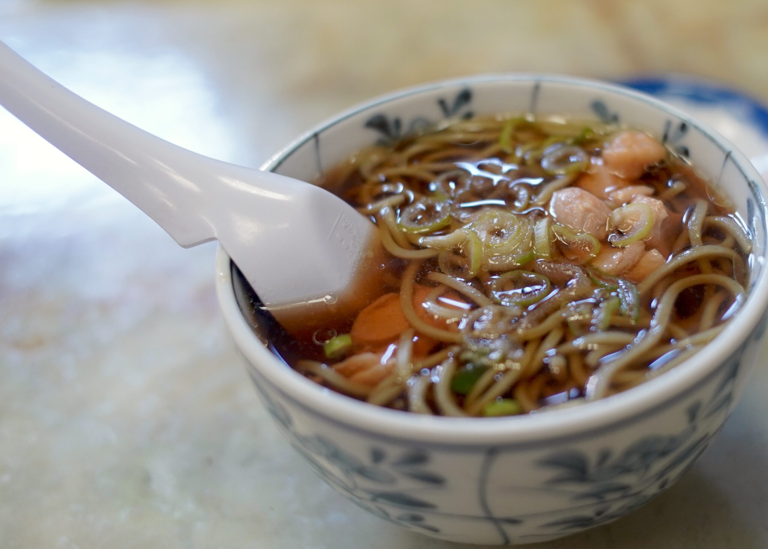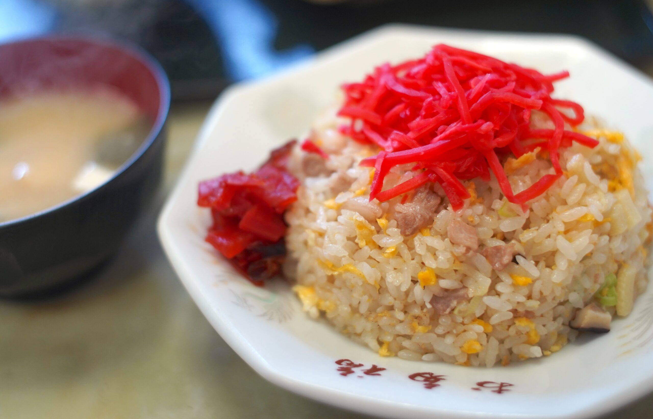 さらに「かしわそば」のそばは、なぜか茶そばであ離、炒飯は味わいが淡く、そのかわりに紅生姜が、たっぷり乗せられているのであった。