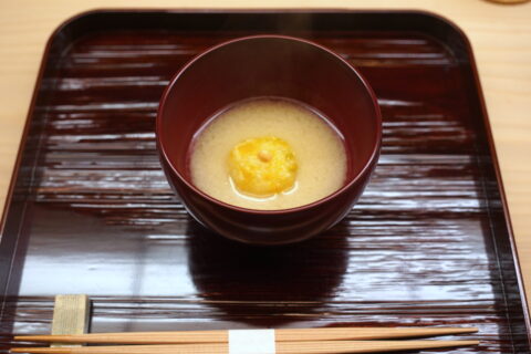 食べ歩き静かで素朴な味は、ゆっくりと舌に溶けていった。 外気で冷えた身体と心を、優しく温める。 先付は銀杏餅で、白味噌を流し、天に辛子を落としてある。……