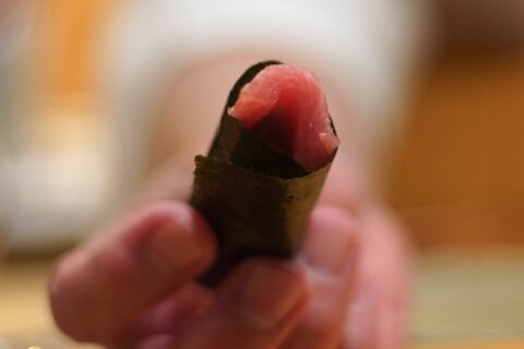 食べ歩き寿司屋ではワインは飲まない。基本日本酒である。 しかしこの店に来たら、ワインを頼んでしまう。 いや親方に、身も心も舌もゆだねる。 驚いたのは、まず干瓢手巻き……