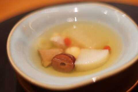 食べ歩き〈舌尖上的睦月〉 雙茸暖身湯 ヒマラヤのモリーユとキヌガサダケのすーぶ。上湯と羊のスープ。体が温まるもので構築。クコとロンガン、生姜 滋味深く体の芯から温まる……
