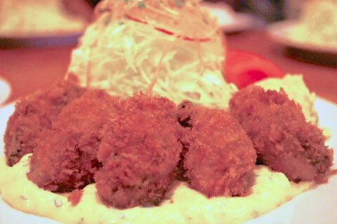 食べ歩き「カキフライはじめました」。 10月になると各食堂には、なんとも食欲そそる案内札が下げられる。 食べたい。 今すぐにもカキフライを食べたい。 ……