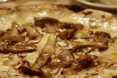 食べ歩きお目当てはポルチーニだった。 「青森県ニンニクとしらすと青のり」 「ナポリ風」、「ジェノベーゼ」、「モッツァレラとトマト」と来て、5枚目に、ポルチーニは登場……