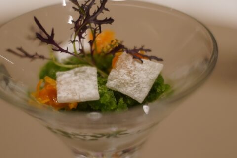 食べ歩き , 1日1甘★水菜| 求肥| 金柑 グラニテ、金柑のコンフィ、バニラのムース 求肥の食感のもちもちが際立つ。 ★ベイリーズ | プラリネ | ラディッキオ 下はベ……